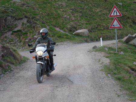 Dieser Zustand sollte aber nicht lange anhalten, denn beim Pass runter fahren, kamen uns ein paar Idioten im Supermoto Stil, immer schön das Füßchen nach vorne strecken, auf unserer Kurvenseite entgegen. Wir konnten zum Glück ausweichen. Die Deppen haben uns erst im letzten Augenblick bemerkt, was wir an ihren mit Schreck weit aufgerissenen Augen, für den Bruchteil einer Sekunde, sehen konnten.